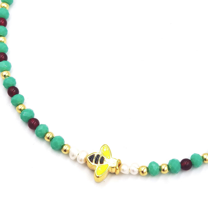 Κολιέ με επίχρυση μέλισσα , ατσάλινο κούμπωμα, μαργαριτάρια και χάντρες αχάτη και γυάλινες