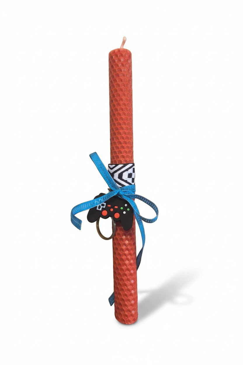 Αυτή η χειροποίητη λαμπάδα από φυσικό μελισσοκέρι συνδυάζει την αυθεντικότητα του παραδοσιακού κεριού με ένα μοντέρνο διακοσμητικό στοιχείο που ξεχωρίζει: μπρελόκ σε σχήμα χειριστηρίου παιχνιδιών.