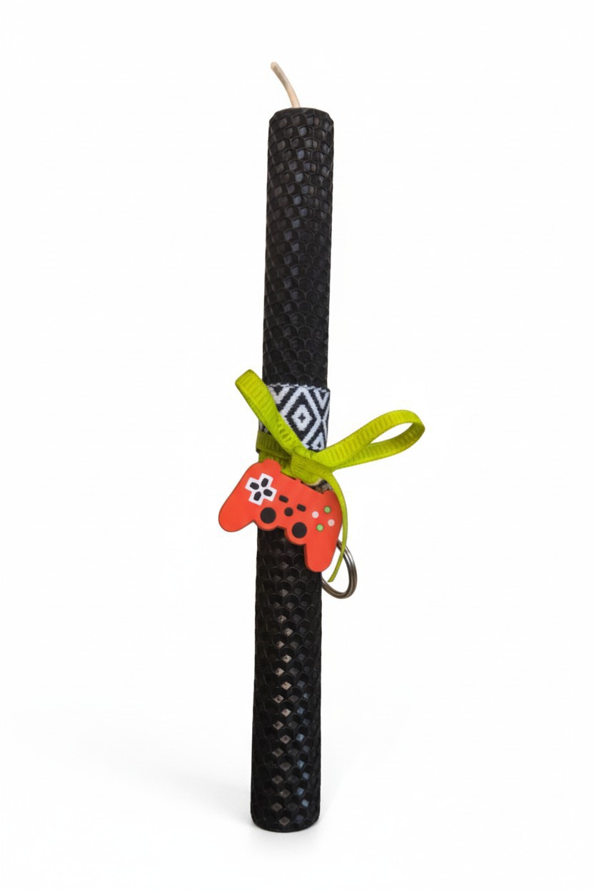 Αυτή η χειροποίητη λαμπάδα από φυσικό μελισσοκέρι συνδυάζει την αυθεντικότητα του παραδοσιακού κεριού με ένα μοντέρνο διακοσμητικό στοιχείο που ξεχωρίζει: μπρελόκ σε σχήμα χειριστηρίου παιχνιδιών.