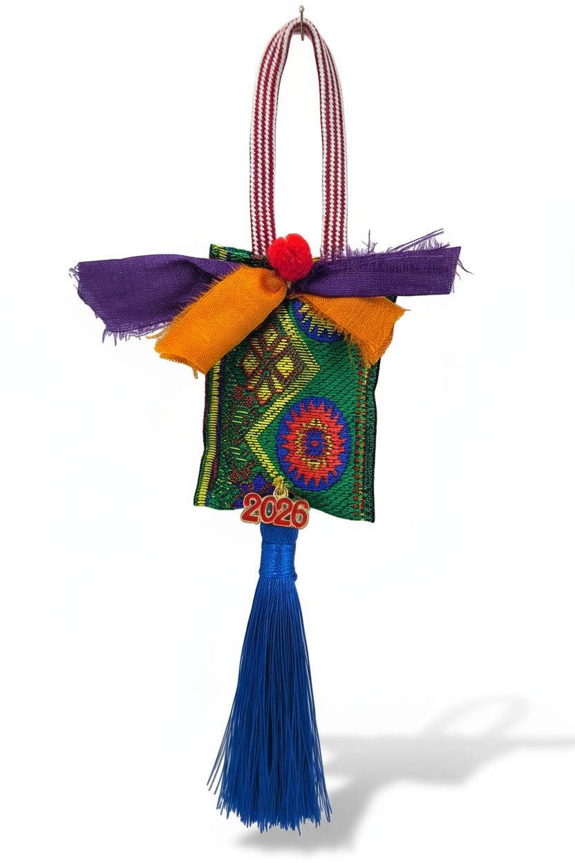 Χειροποίητο γούρι φυλαχτό από τη συλλογή Talisma 2026, φτιαγμένο με τρέσσες ζακάρ, μεταξωτές κορδέλες και πολύχρωμες φούντες. Κάθε κομμάτι είναι μοναδικό, συνδυάζοντας παραδοσιακά μοτίβα με σύγχρονη αισθητική. Ιδανικό για δώρο ή διακόσμηση.