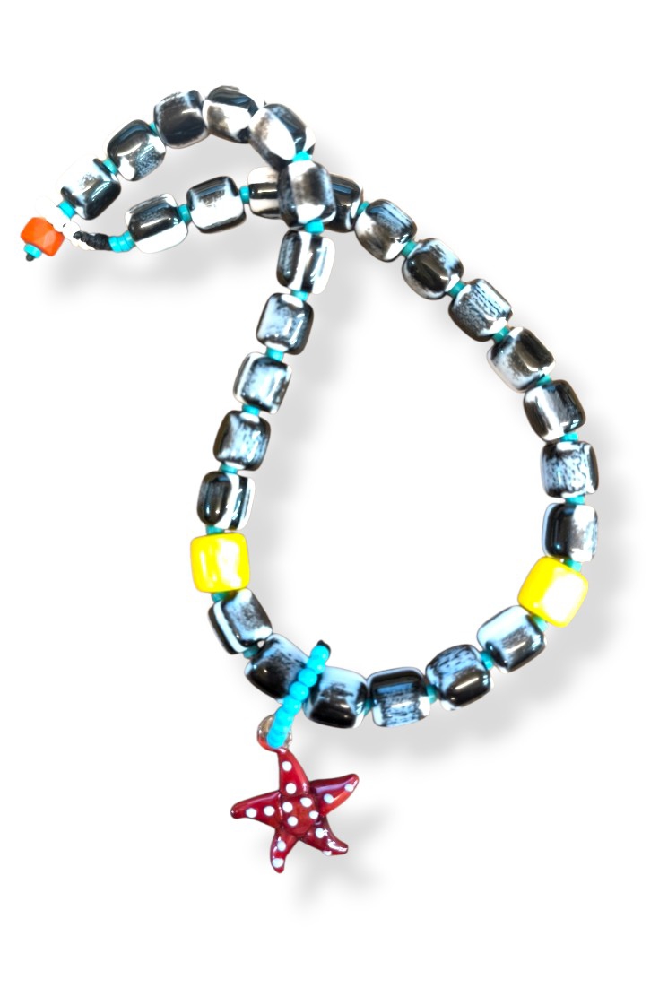 Ένα ξεχωριστό καλοκαιρινό κολιέ που συνδυάζει έντονη αντίθεση, μοντέρνα αισθητική και θαλασσινό χαρακτήρα. Οι ασπρόμαυρες ακρυλικές χάντρες δημιουργούν ένα δυναμικό, καθαρό και stylish αποτέλεσμα, ενώ οι μικρές τιρκουάζ και κίτρινες λεπτομέρειες δίνουν φρεσκάδα, χρώμα και αυθεντικά summer vibes.