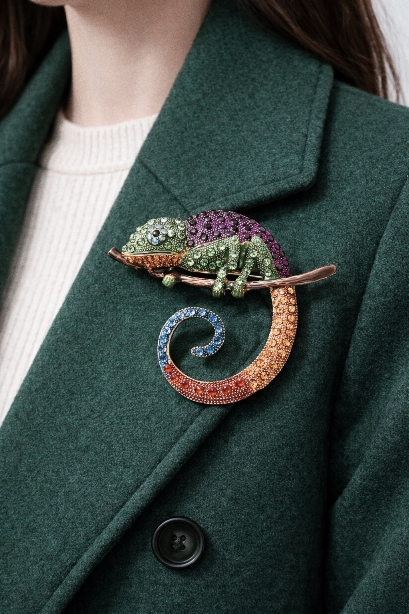 Αυτή η μοναδική καρφίτσα σε σχήμα χαμαιλέοντα ξεχωρίζει για τον έντονο χρωματικό της χαρακτήρα και τον παιχνιδιάρικο, καλλιτεχνικό σχεδιασμό. Ο χαμαιλέοντας αποδίδεται με ανάγλυφες λεπτομέρειες, ενώ το σώμα και η χαρακτηριστική του ουρά διακοσμούνται με στρας σε αποχρώσεις πράσινου, μωβ, κόκκινου, μπλε και πορτοκαλί, δημιουργώντας ένα δυναμικό και εντυπωσιακό αποτέλεσμα.