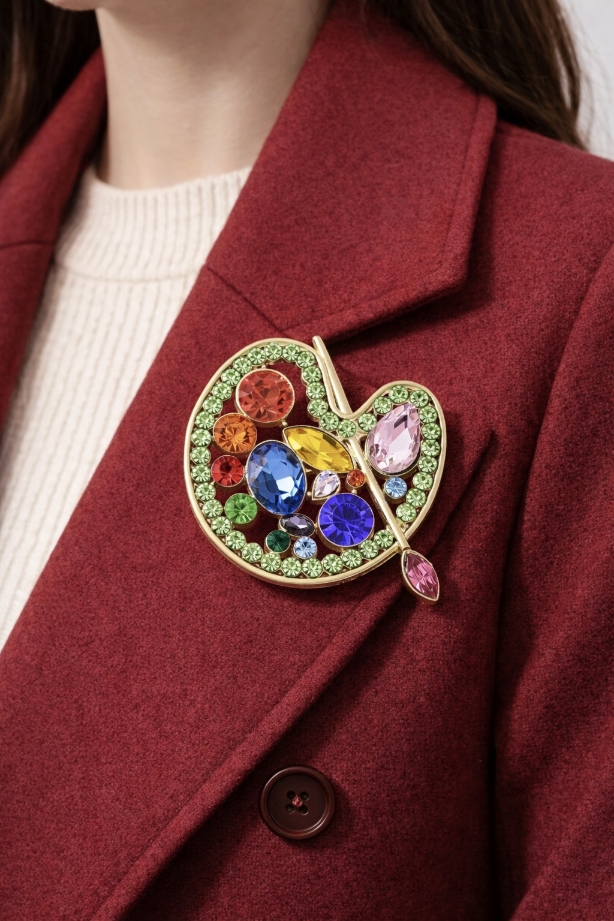 Αυτή η μοναδική καρφίτσα σε σχήμα παλέτας ζωγραφικής αποτελεί ιδανική επιλογή για όσους αγαπούν την τέχνη, το χρώμα και τα ιδιαίτερα αξεσουάρ. Το σχέδιο αποδίδει μια καλλιτεχνική παλέτα με πολύχρωμα στραςσε έντονες αποχρώσεις πράσινου, μπλε, κόκκινου, κίτρινου και μωβ, δημιουργώντας ένα ζωντανό και φωτεινό αποτέλεσμα.