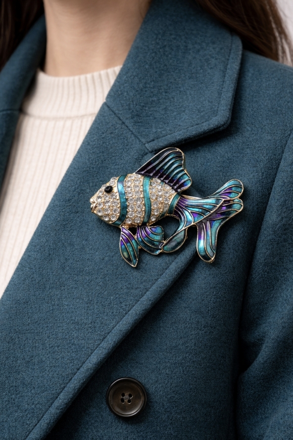 Το σχέδιο του ψαριού αποδίδεται με ανάγλυφες γραμμές, σμάλτο σε αποχρώσεις τιρκουάζ, μπλε και μωβ, ενώ το σώμα διακοσμείται με στρας που χαρίζουν λάμψη και πολυτελή εμφάνιση. Η χρυσή μεταλλική βάση αναδεικνύει τα χρώματα και προσφέρει κομψό φινίρισμα.