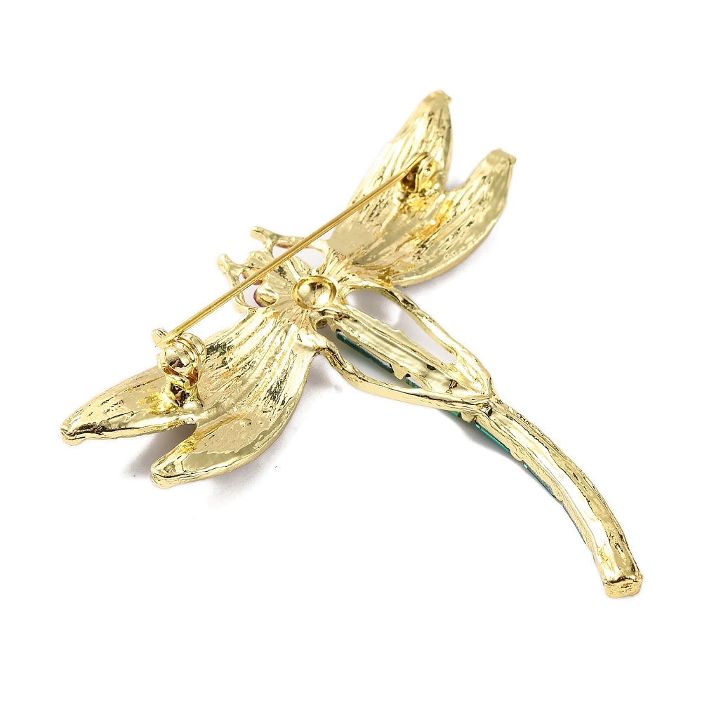 Εντυπωσιακή καρφίτσα λιβελούλα από επιχρυσωμένο κράμα μετάλλου με πολύχρωμα στρας. Κομψό statement αξεσουάρ για παλτό, σακάκια, φορέματα και τσάντες.