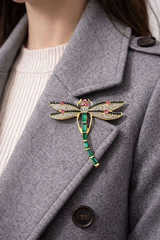 Τα φτερά της λιβελούλας είναι διακοσμημένα με σειρές από στρας, ενώ το σώμα τονίζεται με ορθογώνιες πράσινες πέτρες, προσθέτοντας λάμψη και βάθος στο σχέδιο. Η καρφίτσα είναι κατασκευασμένη από ανθεκτικό κράμα μετάλλου με χρυσή επιμετάλλωση, ιδανική για συχνή χρήση.