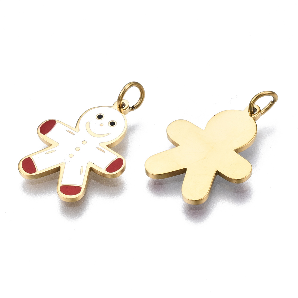 Gingerbread man γούρι σε λευκό σμάλτο από 316L ανοξείδωτο ατσάλι με 14K χρυσή επίστρωση—15,5×12×1 mm με κρικάκι 3,8×0,6 mm,