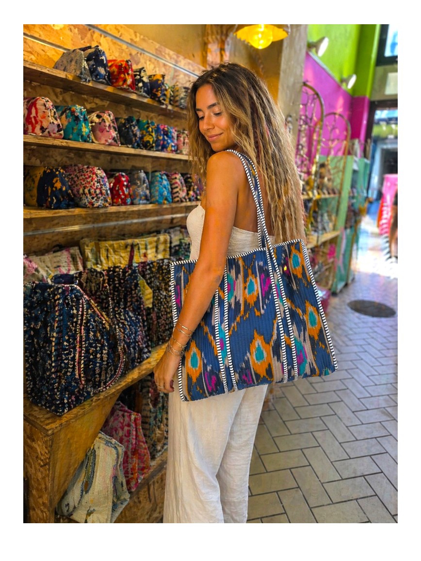 Μοναδική καπιτονέ tote bag από 100% βαμβάκι με εντυπωσιακό έθνικ σχέδιο σε μπλε βάση. Διαθέτει φερμουάρ και εσωτερική τσέπη για άνεση και ασφάλεια.