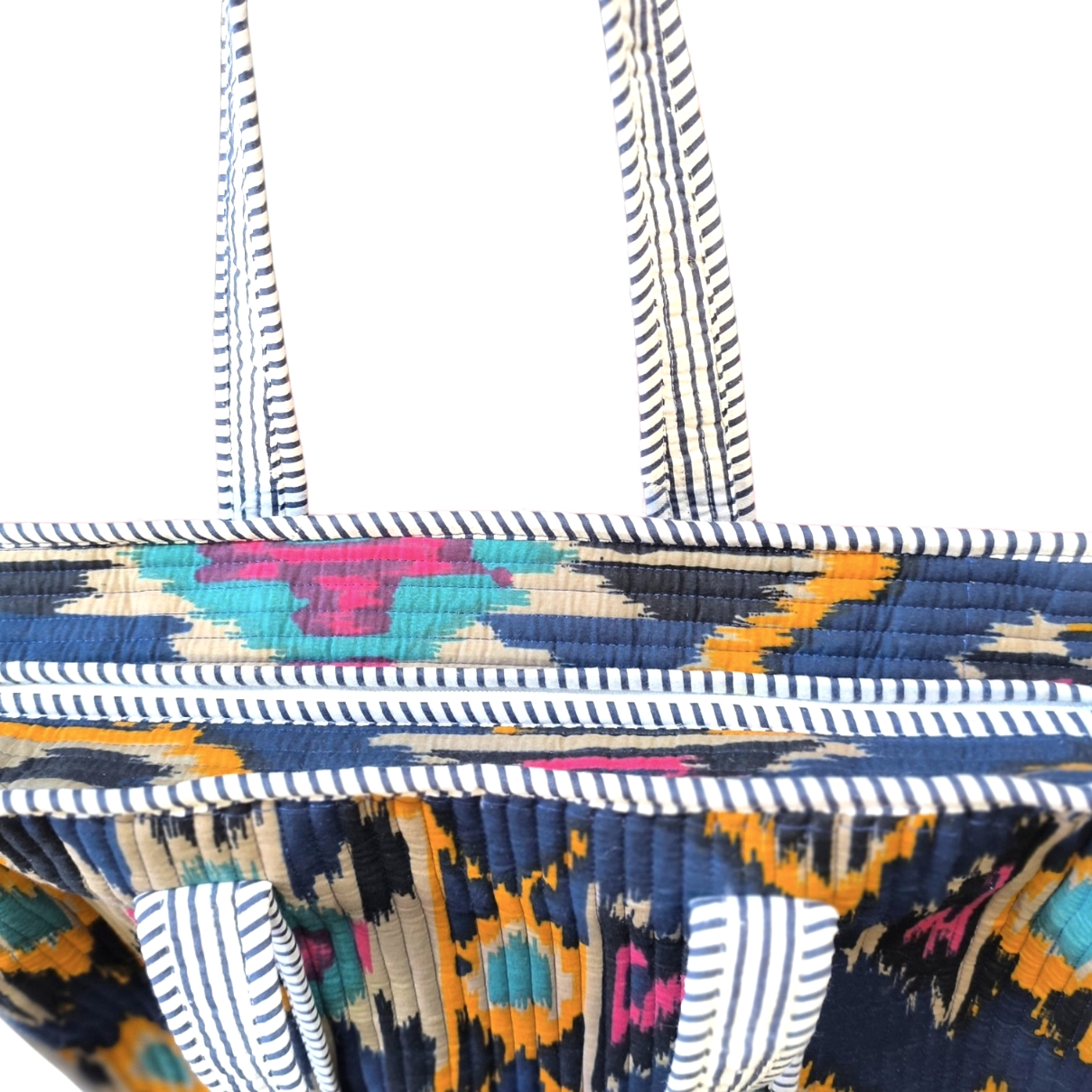 Αναδείξτε το προσωπικό σας στυλ με αυτή την ιδιαίτερη καπιτονέ tote bag από 100% βαμβάκι. Το ξεχωριστό έθνικ μοτίβο σε αποχρώσεις μπλε, μουσταρδί, τιρκουάζ και φούξια δημιουργεί ένα κομψό αλλά και μοντέρνο αποτέλεσμα που τραβάει τα βλέμματα.