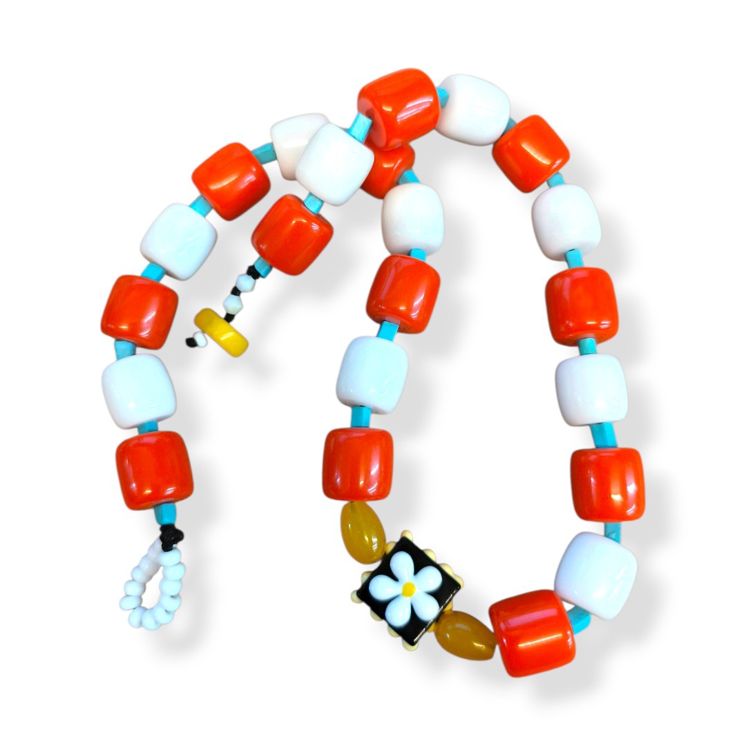 Καλοκαιρινό κολιέ με κόκκινες και λευκές ακρυλικές χάντρες και διακοσμητικό στοιχείο με λουλούδι. Ιδανικό για φωτεινά και playful beach looks..