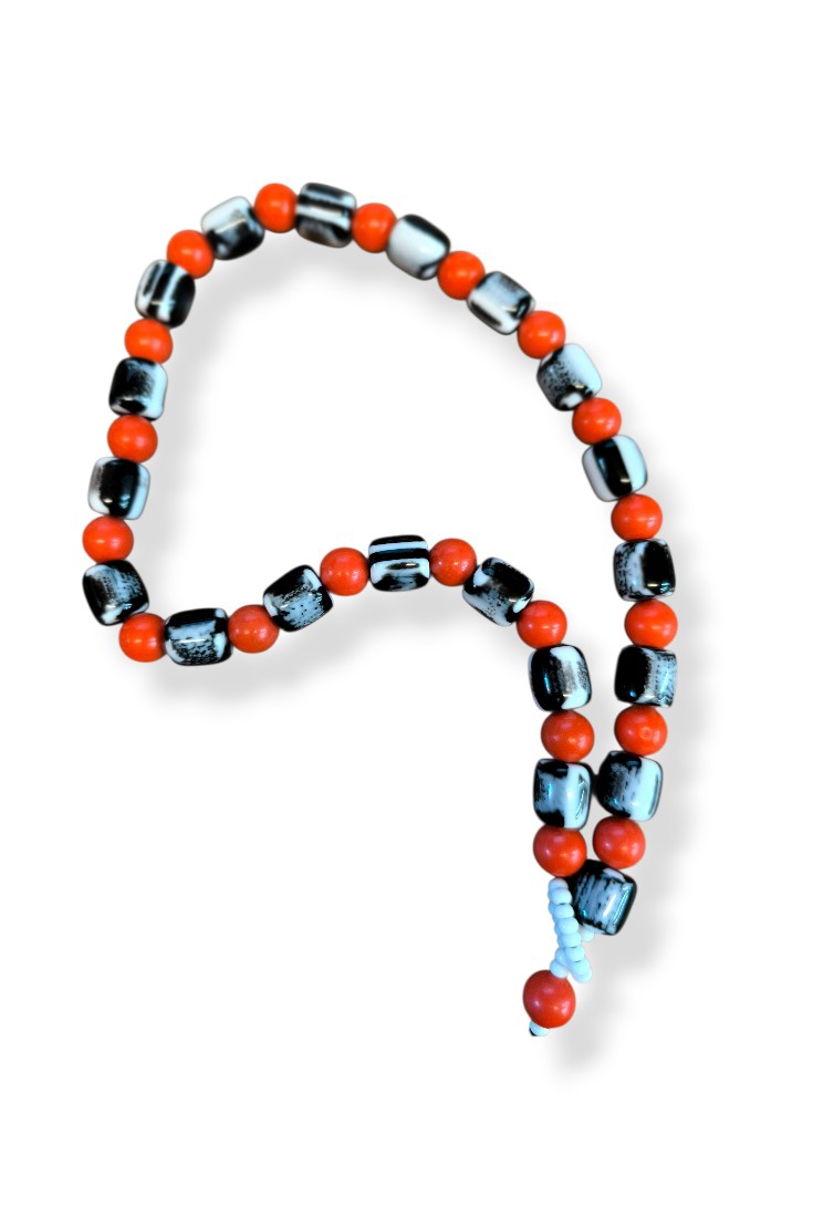 Ένα κομψό αλλά ταυτόχρονα δυναμικό καλοκαιρινό κολιέ που συνδυάζει την ένταση του κόκκινου με τη διαχρονικότητα του ασπρόμαυρου. Οι ακρυλικές χάντρες σε εναλλαγή δημιουργούν ένα μοντέρνο και ισορροπημένο σχέδιο, ιδανικό για όσους αγαπούν τα καθαρά αλλά έντονα κοσμήματα.