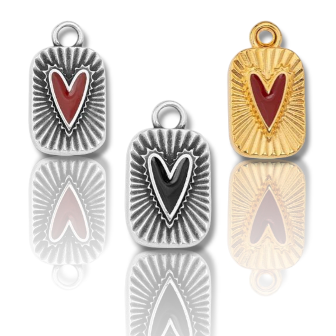 Δώστε ρομαντική και ξεχωριστή νότα στις δημιουργίες σας με το κρεμαστό στοιχείο με καρδιά. Το ορθογώνιο σχέδιο με ανάγλυφες λεπτομέρειες και ένθετη καρδιά σε κόκκινο ή μαύρο χρώμα αποπνέει vintage γοητεία και παράλληλα μια bold αισθητική που ταιριάζει σε κάθε στυλ κοσμήματος.