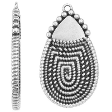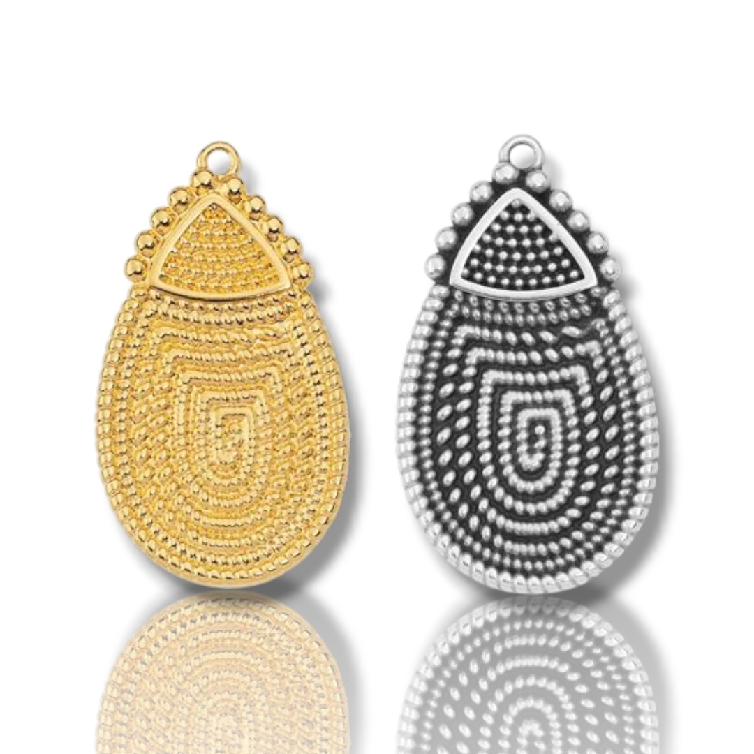 Αναδείξτε τις χειροποίητες δημιουργίες σας με το εντυπωσιακό κρεμαστό στοιχείο σε σχήμα σταγόνας, κατασκευασμένο από ζαμακ με επιμετάλλωση. Διαθέσιμο σε επίχρυσο και επάργυρο, με περίτεχνο γεωμετρικό ανάγλυφο σχέδιο που χαρίζει μια bold και vintage αισθητική.
