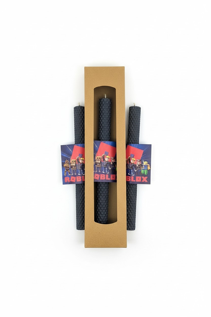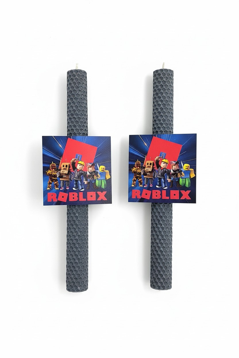 Πασχαλινή λαμπάδα Roblox από φυσικό μελισσοκέρι, με ξύλινο στοιχείο. Ιδανική για παιδιά που αγαπούν το Roblox και για γονείς που αναζητούν ποιοτική επιλογή.