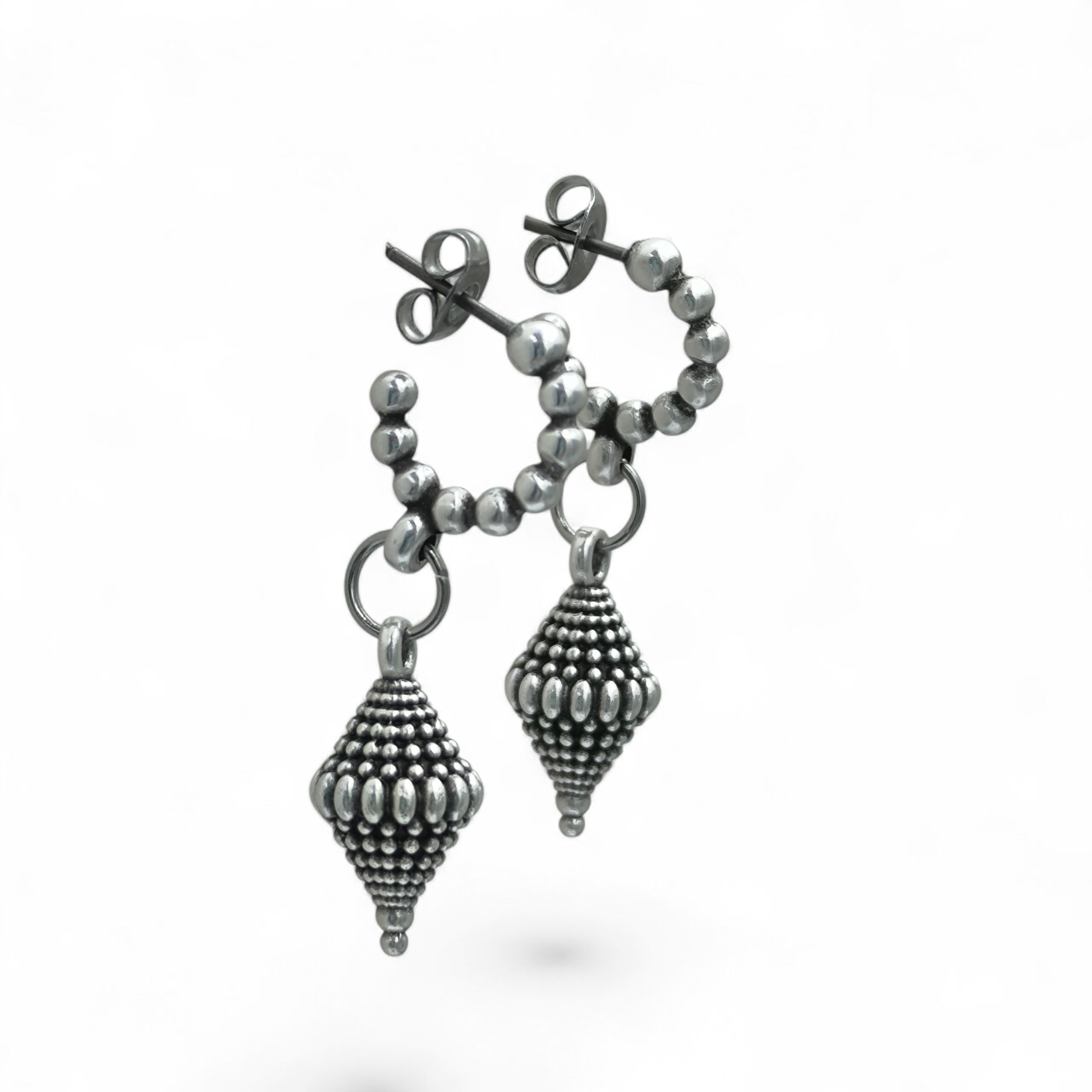 Τα σκουλαρίκια “Luna Beads” συνδυάζουν την κομψότητα του επάργυρου μετάλλου με τον παιχνιδιάρικο σχεδιασμό από χάντρες. Η κρεμαστή διακόσμηση σε ανάγλυφο σχήμα ρόμβου χαρίζει κίνηση και στυλ, κάνοντάς τα ιδανικά για όσες αναζητούν ένα μοναδικό, statement αξεσουάρ.