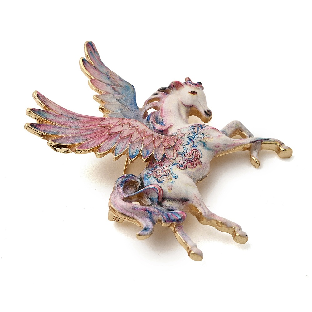Εντυπωσιακή καρφίτσα Πήγασος από κράμα μετάλλου με σμάλτο σε απαλές ροζ και μπλε αποχρώσεις και χρυσή βάση. Ιδανική για παλτό, σακάκια, φορέματα και statement εμφανίσεις.