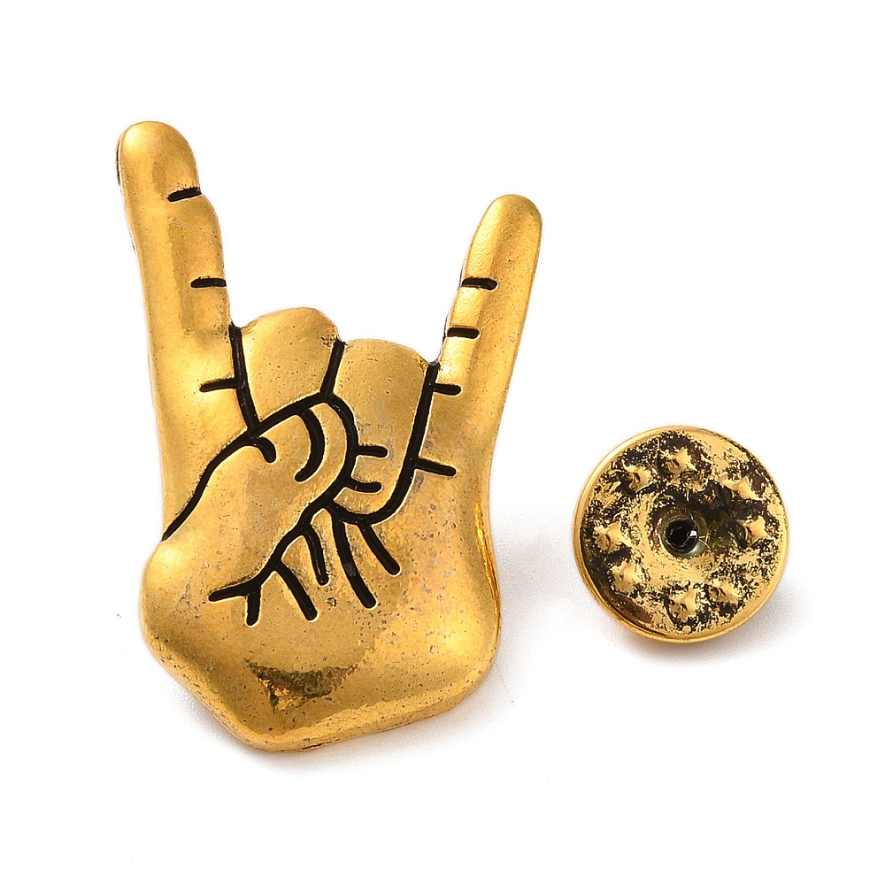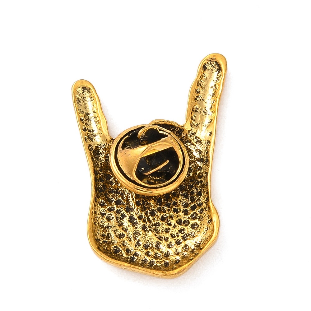 Vintage καρφίτσα σε σχήμα χειρονομίας rock hand από μεταλλικό κράμα σε antique χρυσή απόχρωση. Ιδανική για ρούχα, backpacks και statement εμφανίσεις.