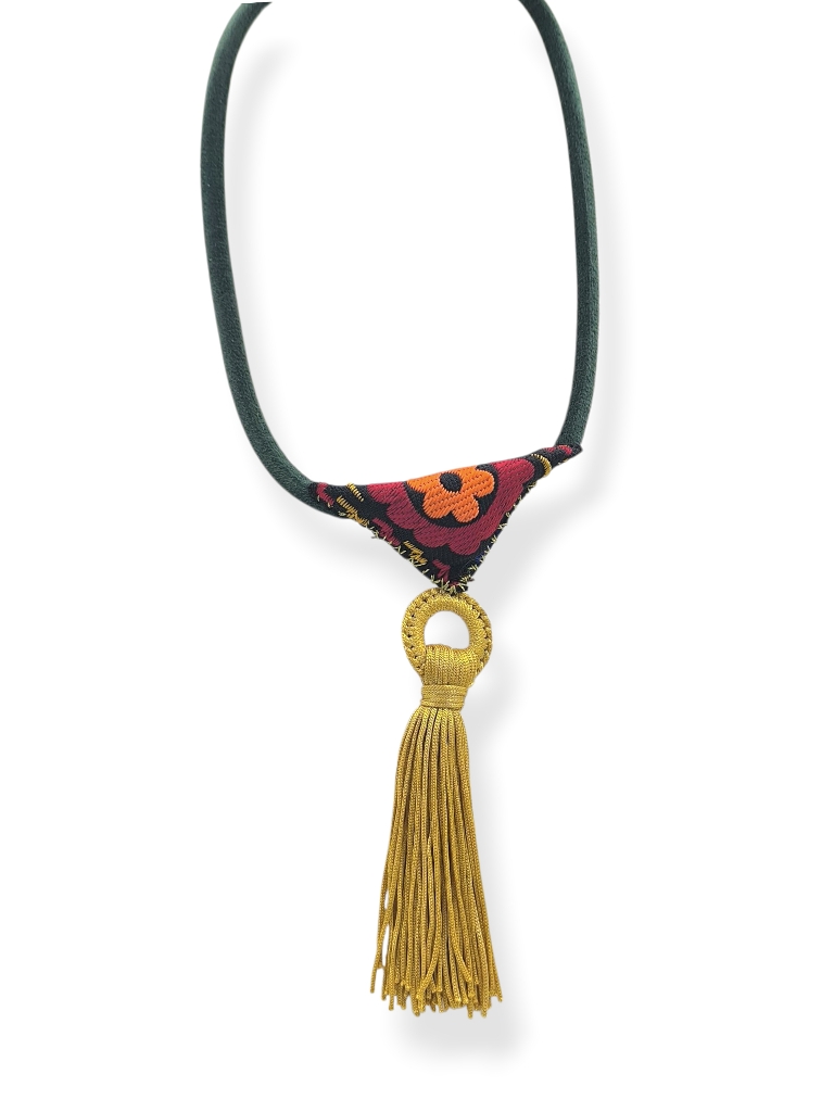 Κολιέ φυλαχτό με μαύρο βελούδινο κορδόνι, ζακάρ τρέσσα με φλοραλ μοτίβο και εντυπωσιακή χρυσή φούντα. Διαθέτει κούμπωμα από ανοξείδωτο ατσάλι για άνετη και ασφαλή εφαρμογή.